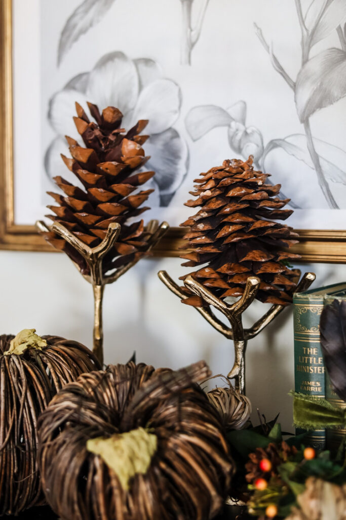 - Edit & Add: The pretty turkey feathers stayed because they feel like Fall without being Halloween-specific. Then, I introduced a few new elements to reinforce our cozy, neutral palette: a couple of rattan pumpkins for woven texture, and some brass pillar holders where I swapped candles for large, interesting pinecones.