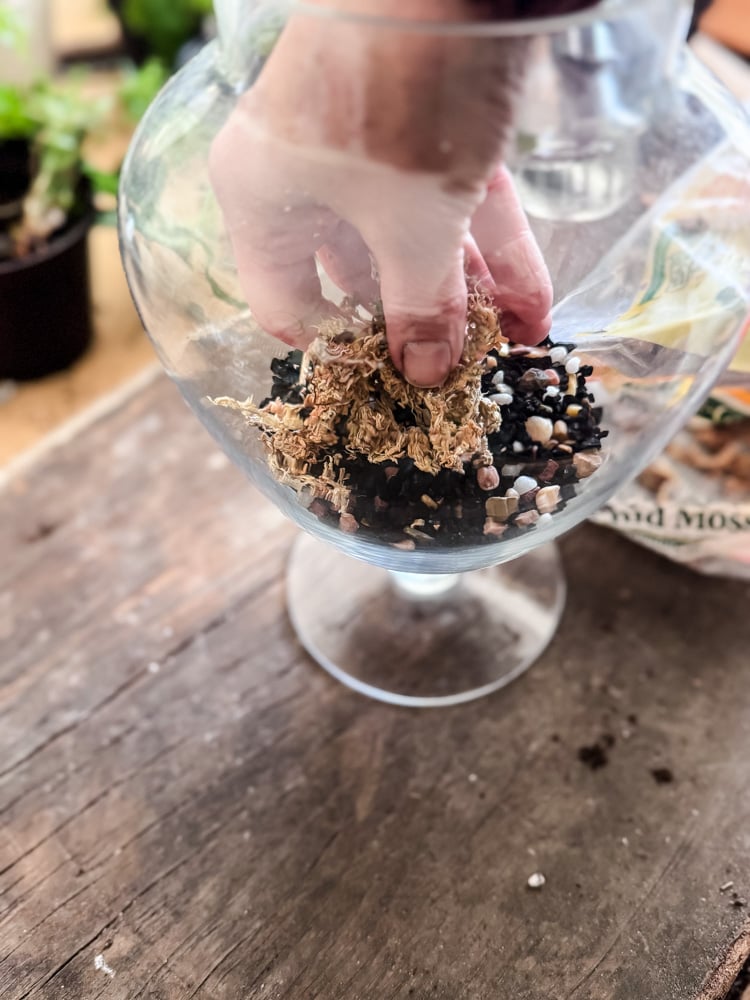 Whether you’re building a large terrarium or something on a smaller scale, you need to follow the same layering technique for a closed terrarium. Start with a layer of pebbles or gravel for drainage, a small amount of activated charcoal to keep everything fresh and healthy, a layer of sphagnum moss (which will create a barrier between the drainage and the potting soil), and a few inches of potting mix before adding your small plants.
