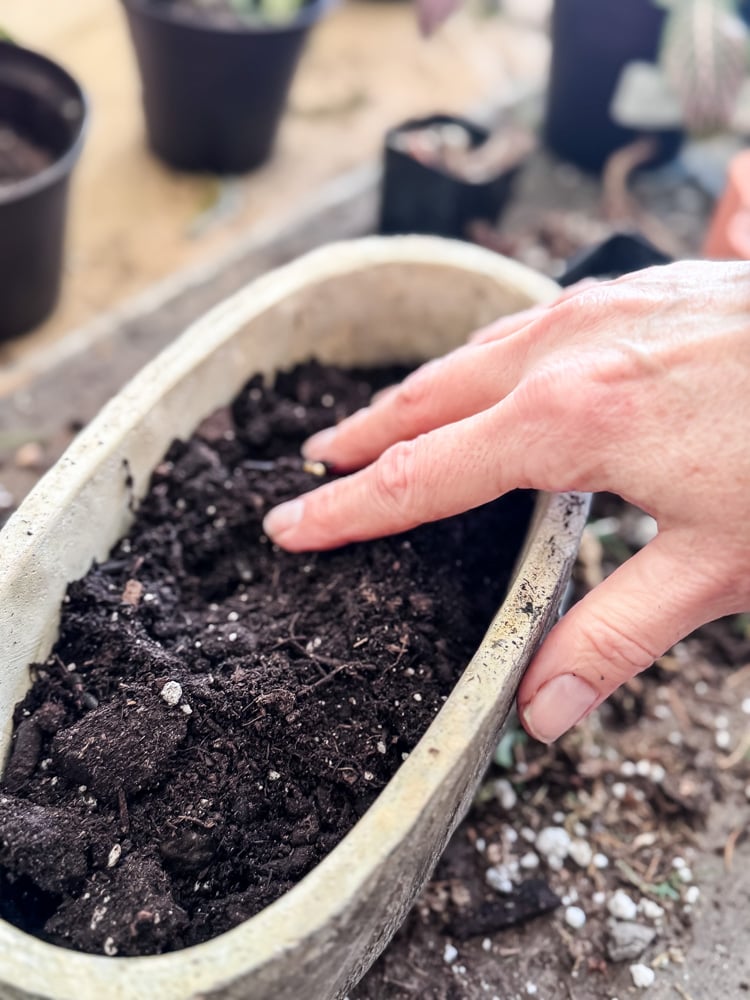 Succulents need soil that drains quickly and doesn’t hold onto moisture. So for this colander, I used a cactus & succulent potting mix.